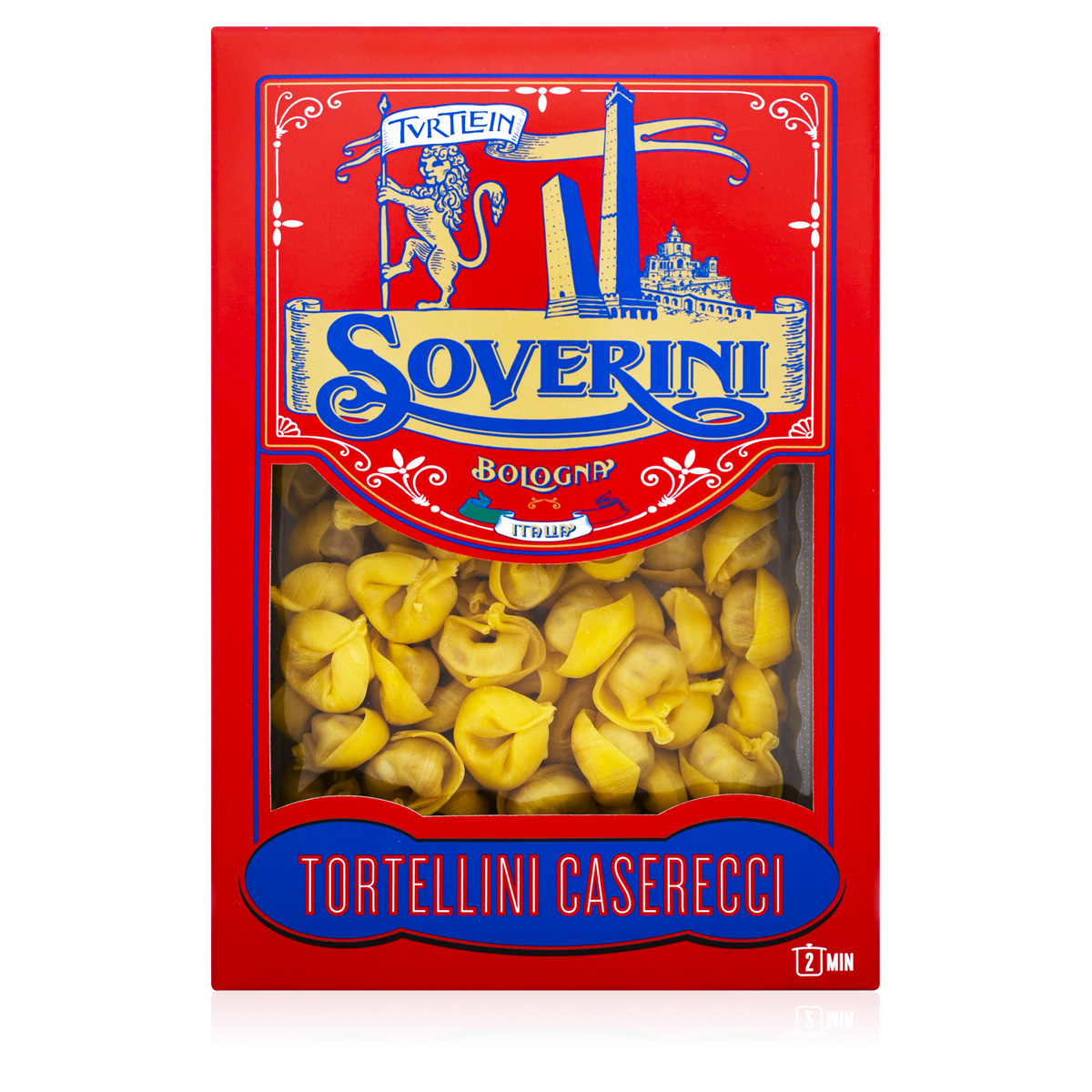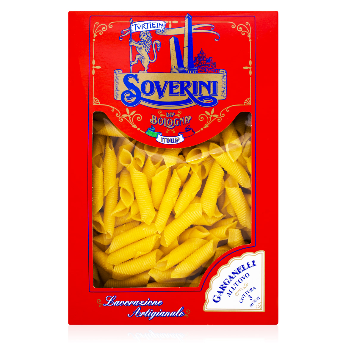 Solo uova fresche con farina di grano tenero speciale con basso conenuto di ceneri e semola Kronos con alta percentuale di glutine consentono alla Soverini di produrre anche altre referenze tipiche come i passatelli e la zuppa imperiale, i tortellacci Bolognesi con vari gusti tipici Emiliani, i garganelli gramigna e le tagliatelle.
