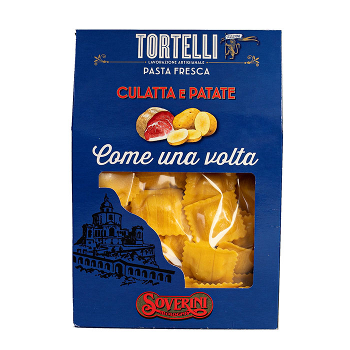 Ripieno (40% sul totale): Purea di Patate 48%, Culatello 24% ( Carne di suino, sale), Ricotta 12% ( Siero di LATTE, crema di LATTE), Grana Padano 8,5% ( LATTE, sale, caglio, Conservante Lisozima da UOVO), Pangrattato 5% (Farina di GRANO tenero, sale, lievito) , UOVO 1%, Sale , Noce Moscata. Conservante: potassio sorbato.