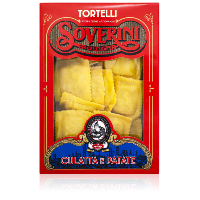 Ripieno (40% sul totale): Purea di Patate 48%, Culatello 24% ( Carne di suino, sale), Ricotta 12% ( Siero di LATTE, crema di LATTE), Grana Padano 8,5% ( LATTE, sale, caglio, Conservante Lisozima da UOVO), Pangrattato 5% (Farina di GRANO tenero, sale, lievito) , UOVO 1%, Sale , Noce Moscata. Conservante: potassio sorbato.